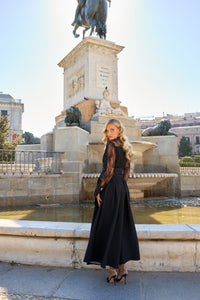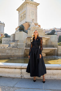 The most stunning jacquard dress, with embellished pearl and lace neck detail