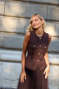 Rich brown waistcoat with subtle sparkle detail, gold buttons & belt